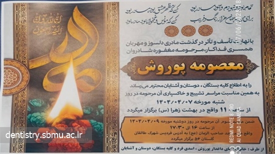 دانشکده دندانپزشکی ضمن عرض تسلیت به ایشان و خانواده محترمشان، غفران الهی برای آن مرحوم و صبر جمیل برای بازماندگان آرزومند است.