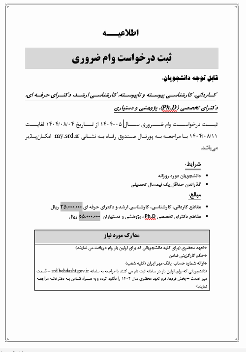 ثبت درخواست وام ضروری (مقاطع کاردانی- کارشناسی- کارشناسی ارشد- دکترای حرفه ای- دکترای تخصصی  و دکترای پژو هشی(Ph.d) و تخصص (دستیاران) از تاریخ 04/08/1404 لغایت 11/08/1404 آغاز می‌شود.