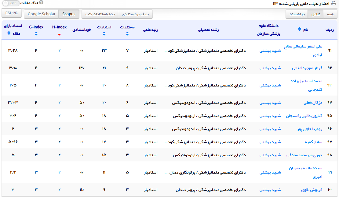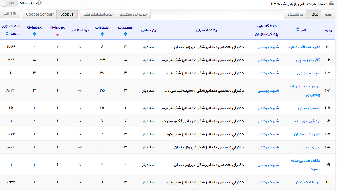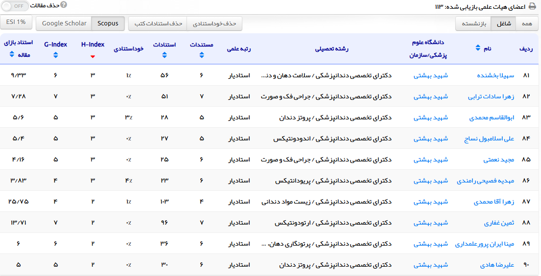 لیست اعضای هیات علمی دانشکده دندانپزشکی در سایت علم سنجی وزارت بهداشت در تاریخ 1404/12/05
