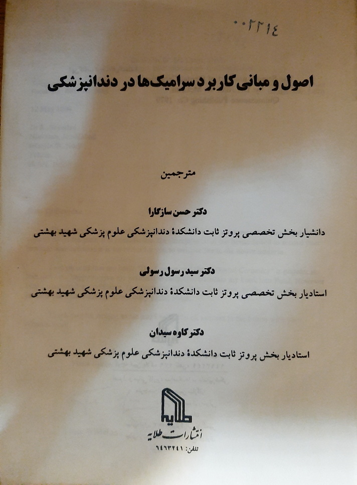 اصول و مبانی کاربرد سرامیک در دندانپزشکی نوشته جان دبلیو مک لین ترجمه حسن سازگارا، رسول رسولی، کاوه سیدان انتشارات طلایه، 1374