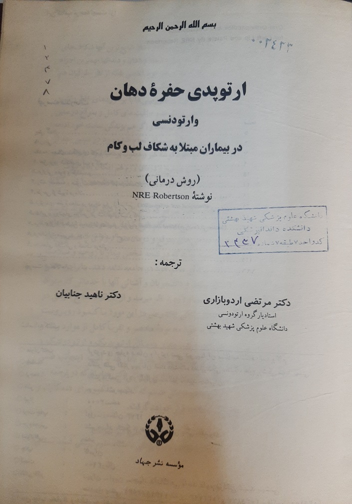 ارتوپدی حفره دهان و ارتودنسی در بیماران مبتلا به شکاف لب و کام: روش درمانی تالیف ان آر ئی رابرتسون؛ ترجمه مرتضی اردوبازاری، ناهید جنابیان نشر جهاد، 1373 |