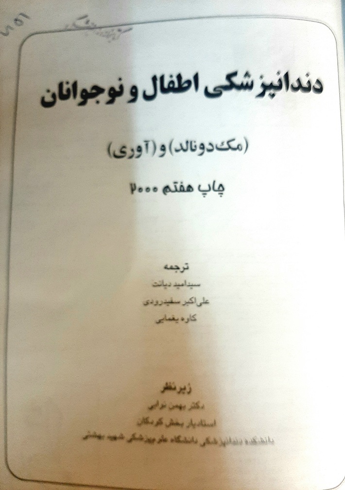 دندانپزشکی اطفال و نوجونان تالیف مک دونالد، آوری؛ ترجمه امید دیانت، علی اکبر سفیدرودی، کاوه یغمایی زیر نظر بهمن نواب زاده نوابی شابک: 9644567498 انتشارات تیمورزاده، 1381 |